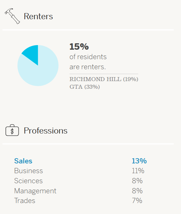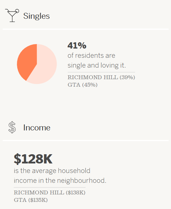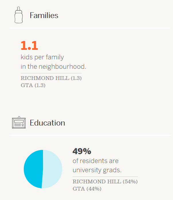 North Richvale is a north GTA neighbourhood notable for its singles, salespeople and tradespeople. It has a higher than average population of recent immigrants from Iran and those from Iran, and Italian, Persian and Russian speakers. Residents tend to be older with a significant number of adults aged 55 to 64 and seniors aged 65 to 74.